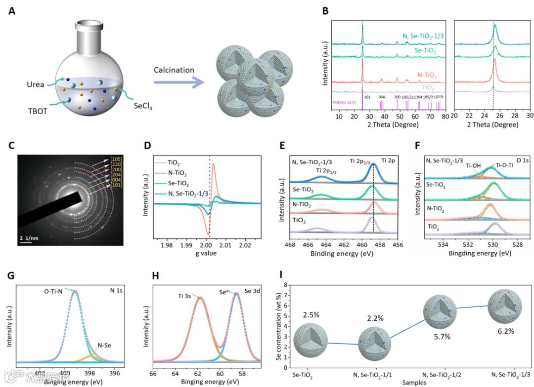 锐钛矿TiO2具有钠化电压适宜、储量丰富以及结构稳定等优点,是潜在的钠离子电池(SIB)负极材料。然而,TiO2存在导电性差和Na+在其晶格内部迁移速率缓慢的不足。杂原子掺杂可以通过引入缺陷和氧空位提高TiO2的导电性,进而提升储钠性能。尽管在单杂原子掺杂方面进行了大量的研究,但关于双杂原子掺杂提升TiO2电化学性能的研究鲜有报道。本文通过N和Se双掺杂策略实现了TiO2储钠性能的全面提升。