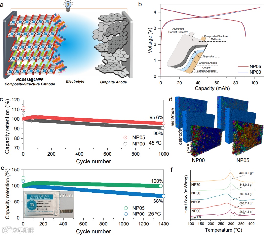 图 6使用软包电池方案评估电化学性能。(a)NP05石墨软包电池的示意图。(b)NP00||石墨和NP05||石墨软包电池的电压分布图,以及软包电池的示意图。(c,e)分别在45℃和25℃下运行的NP00||石墨和NP05||石墨软包电池的循环性能。(e)对具有相同高压实密度的软包电池中使用的正极进行同步辐射X射线CT分析,显示电极中颗粒和孔隙的分布。(f)不同复合结构正极材料在完全充电状态下的DSC曲线。