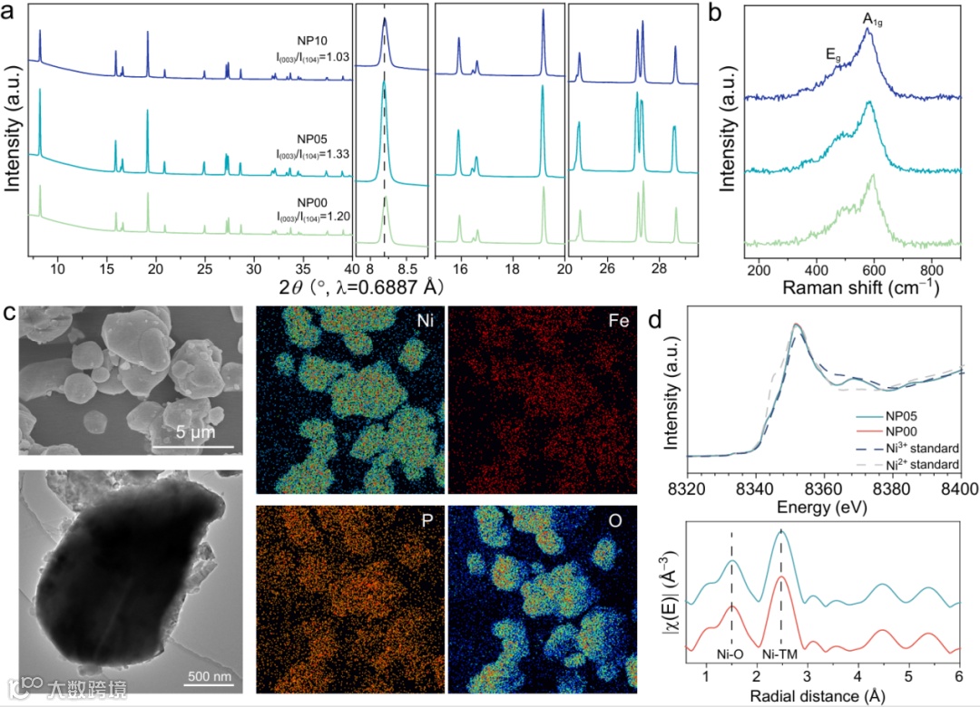 图 1 NP复合结构正极材料的结构表征。(a)合成材料在波长λ=0.6887 Å下的SXRD图。(b)复合结构正极的拉曼光谱。(c)合成的NP05(NCM613@0.5%LMFP)的SEM和TEM图像以及元素分布的EDS图。(d)通过XAS测量获得的Ni K边初始状态的XANES和EXAFS光谱。