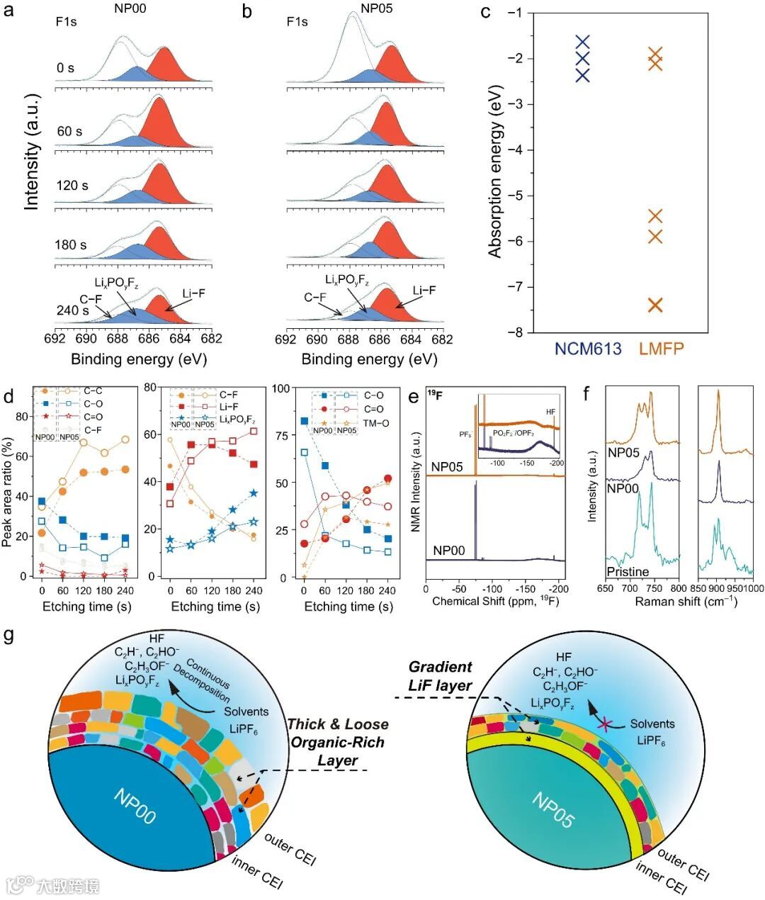 图 4正极晶粒体相外复合结构构造引起的界面化学。(a,b)NP00和NP05在不同Ar+溅射时间下100次循环后的XPS F1s光谱。(c)LiF在层状NCM613(010)和具有LiF(010)表面的橄榄石LMFP上的吸收能。(d)分别在C1s、F1s和O1s XPS光谱中计算化学相互作用的浓度变化。(e,f)分别在NP00和NP05循环100次后电解质的19F NMR和拉曼光谱。(g)循环后NP00和NP05界面上CEI膜形成的示意图。