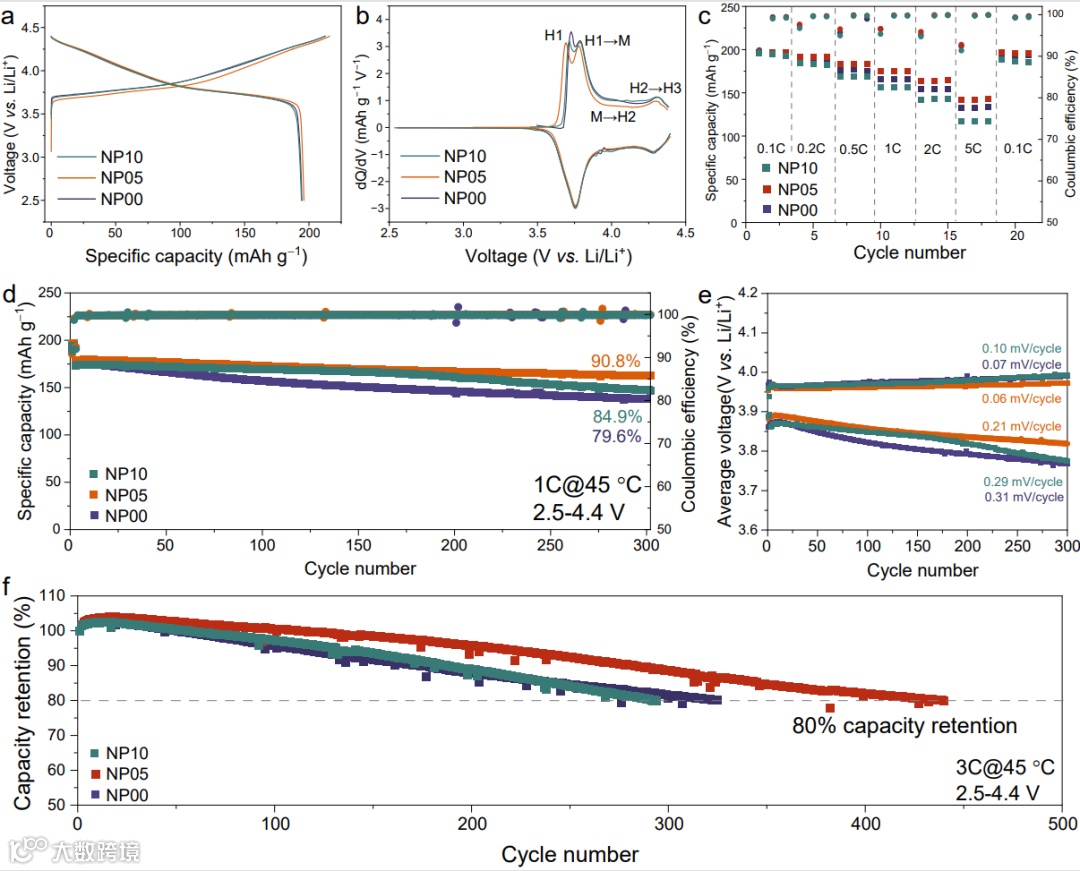 图 2三种复合结构正极材料的电化学性能。(a)典型充电/放电曲线,(b)dQ/dV曲线,(c)倍率性能,(d)1C高温条件半电池的循环性能,(e)1C高温条件下的平均电压变化,(f)3C高温条件下的NP00、NP05和NP10分别保持80%的容量的循环性能。