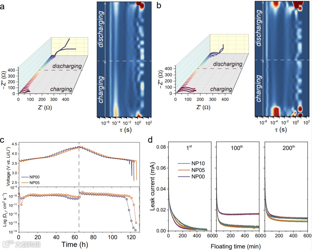 图 3复合正极材料的界面稳定性表征。(a,b)NP00和NP05正极在45℃下进行1C循环时的原位EIS测量和相应的DRT图。(c)GITT模式下NP00和NP05的电压分布和计算的Li扩散系数。(d) 分别在第1、100和200次循环时从NP00、NP05和NP10正极的漏电流。