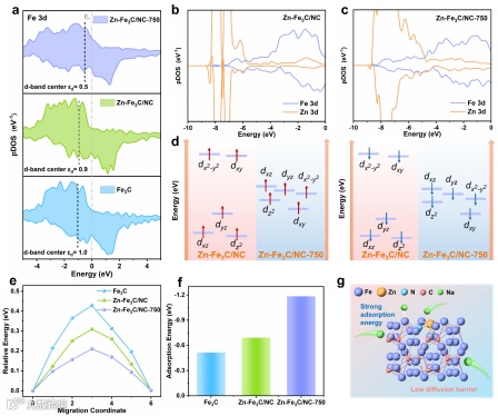 Figure 5. a) PDOS of Fe 3d in Fe3C, Zn-Fe3C/NC, and Zn-Fe3C/NC-750. PDOS of Fe 3d and Zn 3d in b) Zn-Fe3C/NC, and c) Zn-Fe3C/NC-750. d) Zn 3d energy levels in Zn-Fe3C/NC and Zn-Fe3C/NC-750. e) Relative energies of Fe3C, Zn-Fe3C/NC, and Zn-Fe3C/NC-750. f) Adsorption energy of Fe3C, Zn-Fe3C/NC, and Zn-Fe3C/NC-750. g) Diagram of sodium ion adsorption.