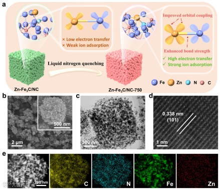 因此该研究采用了一种新型的液氮淬火策略,旨在增强Zn掺杂的Fe3C内部的 d-d 轨道相互作用,以优化其作为电极材料去除 Na+ 的效率。研究通过煅烧和液氮淬火处理,成功构建了由锌铁普鲁士蓝类似物衍生的多孔锌掺杂碳化铁纳米立方体。液氮淬火处理能够增加配位数和增强 d-d 轨道相互作用,通过调节电子结构优化了 Na+ 吸附/解吸过程,从而提高了可逆的 Na+ 吸附。非原位技术证实了钠离子吸附/解吸的机理,并解释了原子和电子结构在运行条件下的动态演变。这些研究结果有助于建立结构-功能关系,并揭示了在电极材料整个生命周期中增强的 d-d 轨道相互作用的贡献机制。此外,密度泛函理论计算还验证了稳健的 d-d 轨道相互作用在改善 Na+ 捕获行为中的关键作用。总之,这项工作阐明了钠离子吸附性能与强的 d-d 轨道相互作用之间的重要关联,为开发电容去离子电极材料提供了一种有效的策略。
