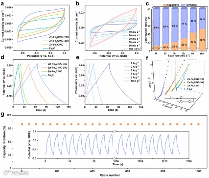 Figure 3. a) CV curves of Zn-Fe3C/NC-750 and counterparts at 10 mV s-1. b) CV curves of Zn-Fe3C/NC-750 at scan rates from 10 to 100 mV s-1. c) Capacitive and diffusion contribution ratio of Zn-Fe3C/NC-750 at different scan rates. d) GCD profiles of Zn-Fe3C/NC-750 and counterparts at 1 A g-1. e) GCD profiles of Zn-Fe3C/NC-750 and counterparts at different current densities. f) Nyquist plots of the Zn-Fe3C/NC-750 and counterparts. g) Long-term GCD test of Zn-Fe3C/NC-750 at 3 A g-1.