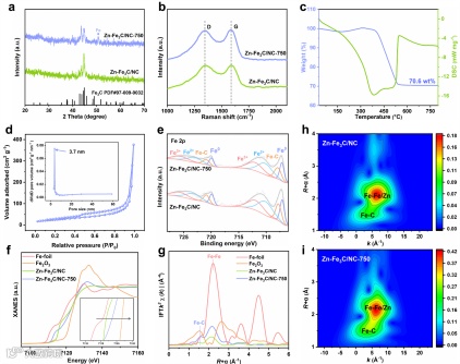 Figure 2. a) XRD patterns for Zn-Fe3C/NC and Zn-Fe3C/NC-750. b) Raman spectra for Zn-Fe3C/NC and Zn-Fe3C/NC-750. c) TG and DSC spectra for Zn-Fe3C/NC-750. d) Nitrogen adsorption-desorption isotherms for Zn-Fe3C/NC-750. e) Fe 2p XPS spectra for Zn-Fe3C/NC and Zn-Fe3C/NC-750. f) Fe K-edge XANES spectra for Fe-foil, Fe2O3, Zn-Fe3C/NC and Zn-Fe3C/NC-750. g) FT k3-weighted Fe K-edge EXAFS in R-space for Fe-foil, Fe2O3, Zn-Fe3C/NC and Zn-Fe3C/NC-750. WT-EXAFS spectra for h) Zn-Fe3C/NC and i) Zn-Fe3C/NC-750.