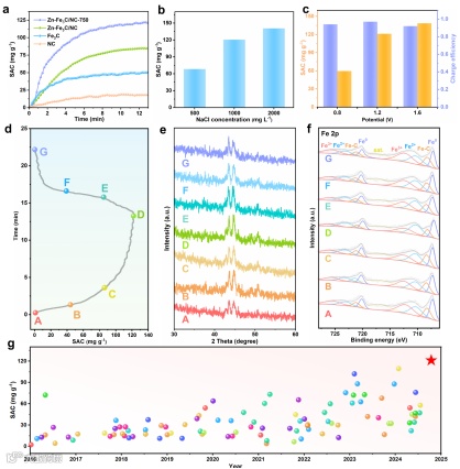 Figure 4. a) SAC of Zn-Fe3C/NC-750 and counterparts. b) SAC of Zn-Fe3C/NC-750 in NaCl solution with different concentration. c) SAC and charge efficiencies of Zn-Fe3C/NC-750 at different voltages. d) SAC of Zn-Fe3C/NC-750 in single CDI charging-discharging cycle. Corresponding ex-situ e) XRD and f) XPS patterns versus time after single charging-discharging cycle. g) Comparison of the desalination performance of Zn-Fe3C/NC-750 with other reported works.