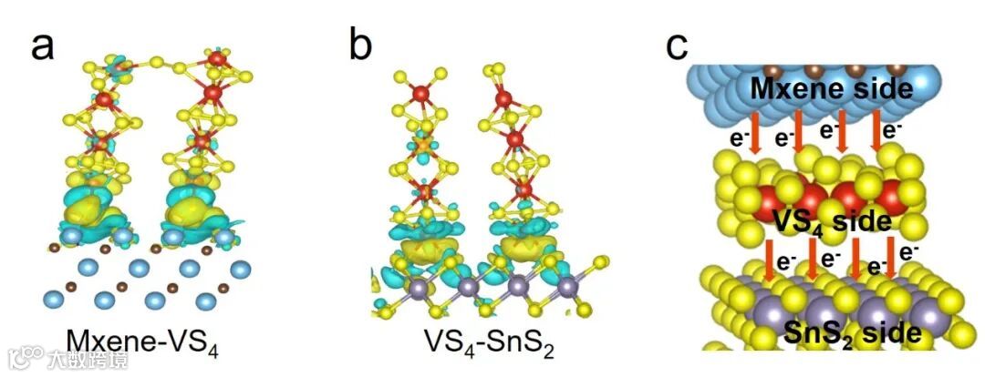 图2:(a) MXene-VS4;(b) VS4-SnS2异质结构的电荷密度差(黄色和蓝色区域分别代表电荷密度的增加和减少);(c) 电子流动方向示意图