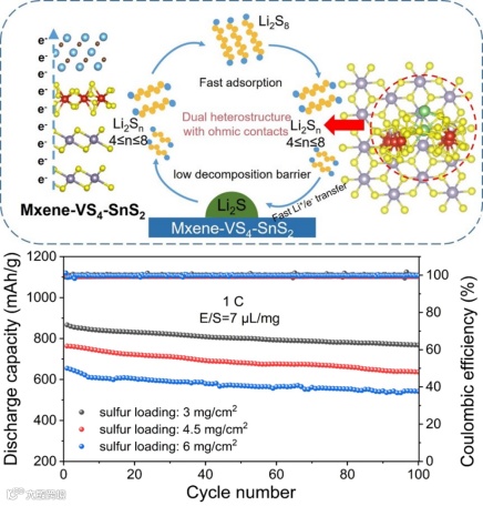 图1. 多硫化物在MXene-VS4-SnS2中的转化示意图与大硫载量下的长循环测试。