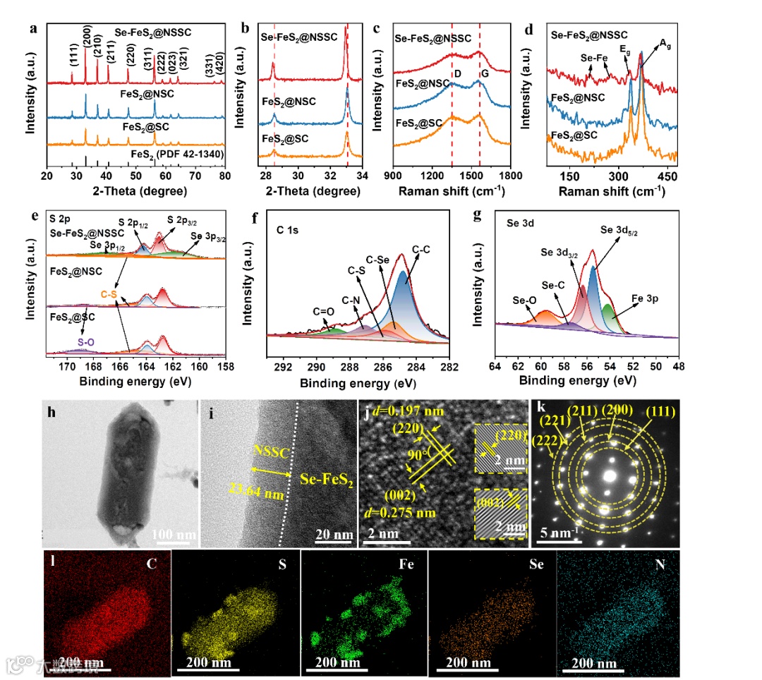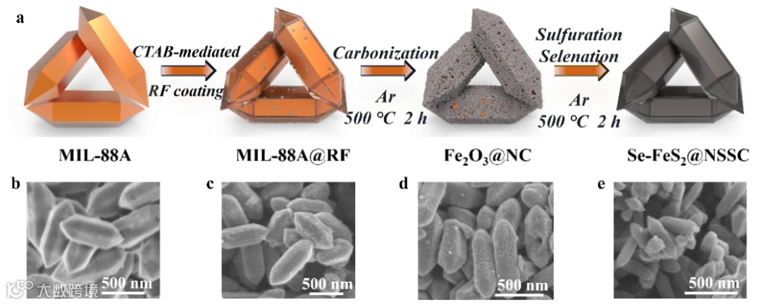文章首先通过简单的溶剂热法合成MIL-88A(Fe)(图1b),并以其为模板,在表面活性剂十六烷基三甲基溴化铵(CTAB)的辅助下包覆间苯二酚-甲醛(RF)树脂层,得到核-壳结构复合材料MIL-88A@RF(图1c);进一步在500℃的氩气气氛中热处理,形成氮掺杂碳包裹的氧化铁(Fe2O3@NC)(图1d)。在此阶段,来自CTAB的氮掺杂进入碳基体,引入结构缺陷,显著增强双碳层的性能。最后一个阶段是Fe2O3@NC、硫(S)和硒(Se)之间的固气反应,生成Se-FeS2@NSSC(图1e)。在同步硒化-硫化反应中,Se和S首先与外层碳层相互作用进行多杂原子共掺杂,然后与Fe2O3核心反应形成Se取代的FeS2。此外,双碳层有效地稳定多面体的形态和结构,这有利于在整个硒化/硫化过程中保持Se-FeS2@NSSC多面体的结构完整性。