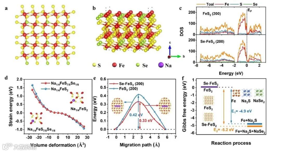 对Se-FeS2@NSSC进行密度泛函理论(DFT)计算分析了硒取代对电化学动力学的影响。图5c态密度(DOS)分析表明,Se-FeS2在费米能级(EF)附近表现出更高的DOS,增强了电子导电性、反应性和Na+吸附;硒取代对结构稳定性和应力-应变能的影响也很显著(图5d)。硒取代之后明显降低了Na+的扩散能垒和吉布斯自由能(图5e,f)。