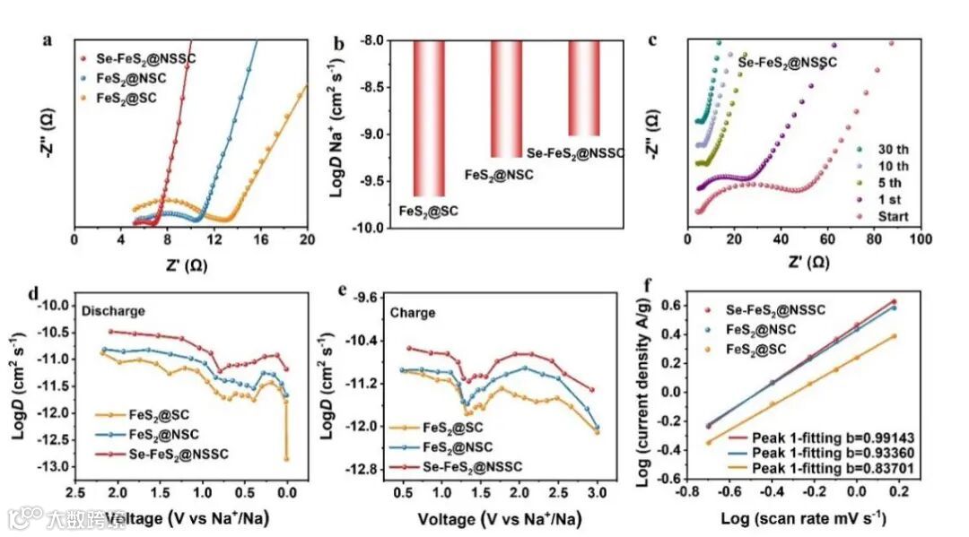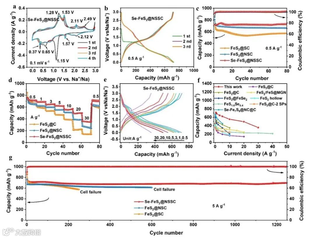 电化学性能测试表明,Se-FeS2@NSSC的电化学性能最优,初始放电容量为725.7 mAh g-1,初始充电容量为711.3 mAh g-1,库仑效率(CE)高达98.0%(图3b,c),随后的CE接近100%,形成坚硬且薄的SEI膜。最优的倍率性能,在30 A g-1的电流密度下还保持有355.1 mAh g-1的高比容量(图3d)。与其他的硫化铁基材料相比,Se-FeS2@NSSC在各种电流密度的容量方面都更优异(图3f)。Se-FeS2@NSSC在1250次循环后,其比容量还保持697.8 mAh g-1,保留率达到了89.6%。Se-FeS2@NSSC的这种优势可以归因于封装的碳材料提高了导电性,并保证了结构的完整性。独特的核壳纳米结构与孔隙,允许电解质和活性材料之间广泛的相互作用,缩短Na+扩散路径,从而提高电荷转移速率。硒在二硫化铁中的取代改善了电子结构,提高了钠嵌入和脱出的反应动力学。其次,在双碳层中引入硒、硫和氮多杂原子掺杂改变了碳层的电子结构,增加了缺陷和活性位点,进一步增强了电荷转移动力学。