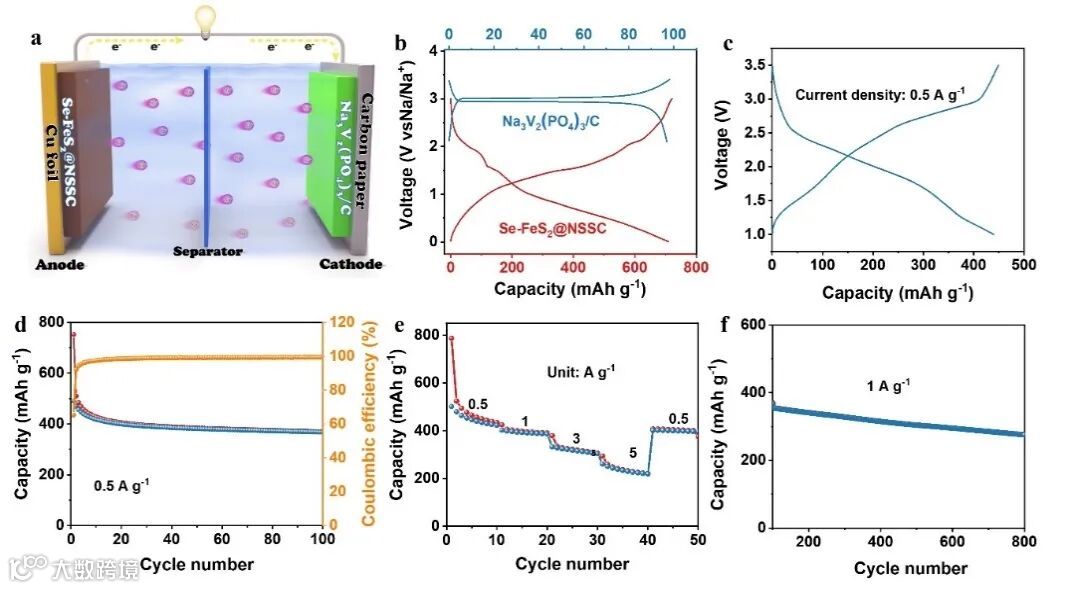 图6. Se-FeS2@NSSC||Na3V2(PO4)3/C的全电池性能