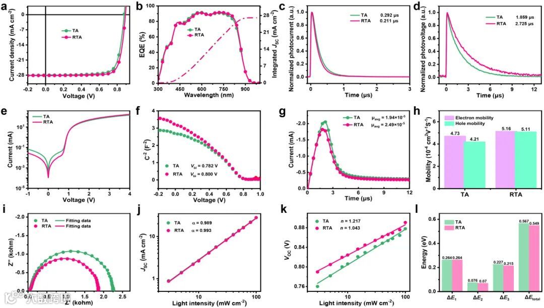 图4. ITO/2PACZ/PM6:L8-BO-X/PNDIT-F3N/Ag器件的a)电流密度-电压特性曲线;b)外量子效率曲线;c)瞬态光电流曲线;d)瞬态光电压曲线;e)暗电流特性曲线;f)Mott-Schottky测量结果;g)光诱导线性增压电荷提取曲线;i)阻抗谱;J)JSC与Plight和k)VOC与Plight曲线;h)电子和空穴迁移率直方图;l)TA或RTA处理器件的能损参数。