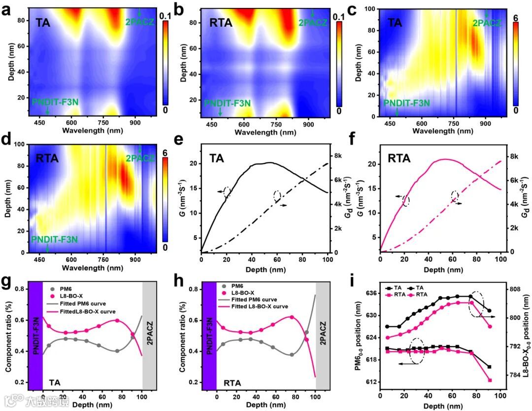 图5. a)TA或RTA处理PM6:L8-BO-X薄膜中子层吸收的二维轮廓图,垂直比例尺表示光密度。c、d)经TA或RTA处理的BHJ薄膜的激子生成云图,垂直比例尺表示模拟的最大激子生成速率。e、f)从活性层顶部到底部的激子产生率。g、h)TA或RTA处理的共混膜中PM6和L8-BO-X在深度方向上的组成分布。i)PM60-0和L8-BO-X0-0峰位置随共混膜深度方向分布。
