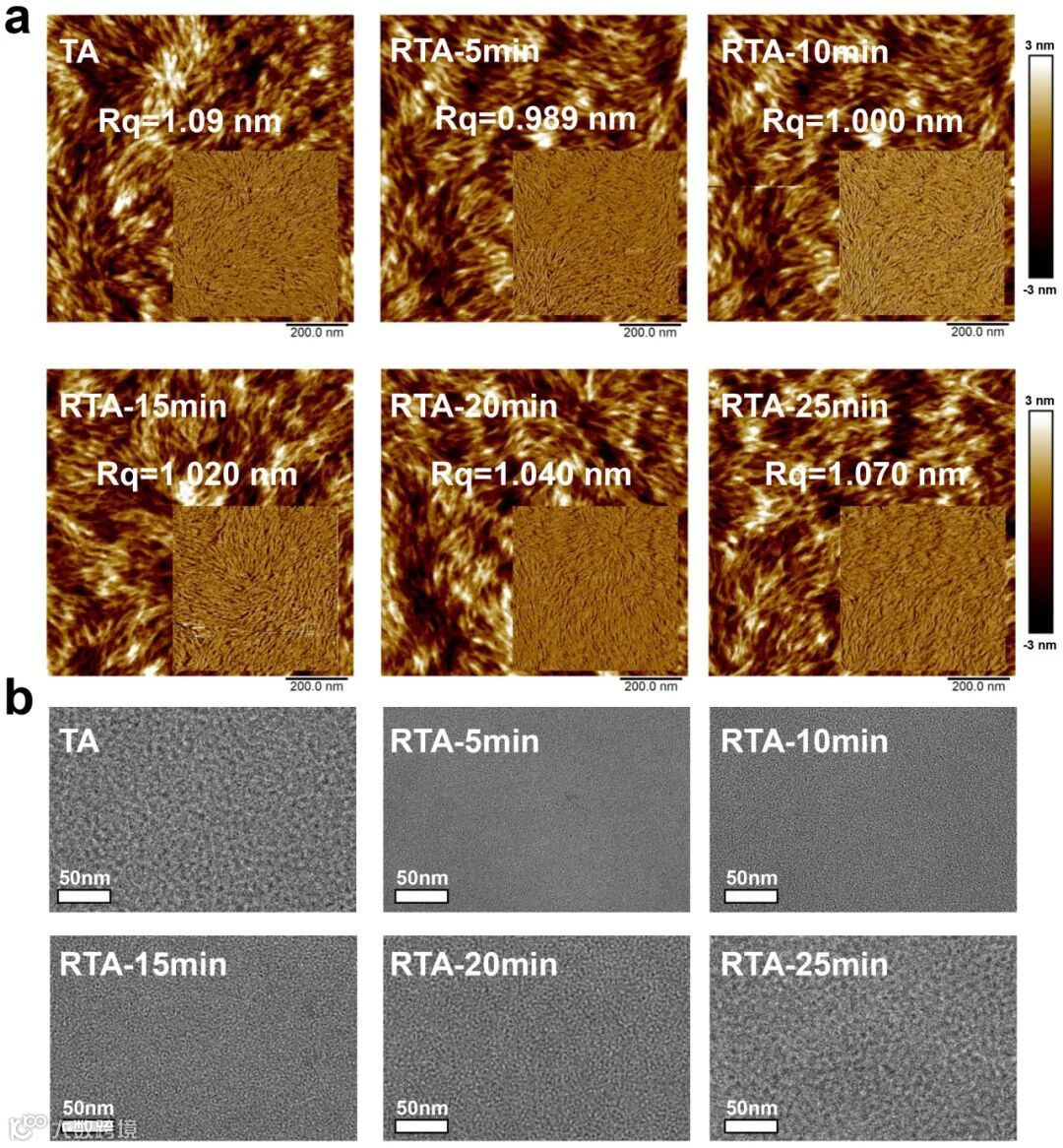 图2. a)TA和RTA方法处理的PM6:L8-BO-X薄膜的原子力显微镜高度图像和b)透射电子显微镜图像。
