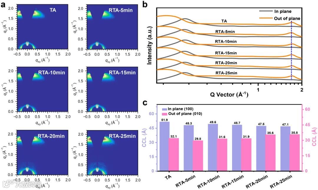 图3. a)2D 掠入射广角X射线散射图案;b)掠入射广角X射线散射图案在外和面内方向上的切线;c)TA和RTA方法处理的PM6:L8-BO-X薄膜的(100)峰(面内)和(010)峰(面外)的晶体相干长度直方图。
