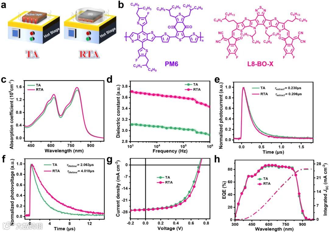 图1. a) 活性层传统TA和RTA处理示意图;b)PM6和L8-BO-X的化学结构;c)TA和RTA处理PM6:L8-BO-X薄膜的吸收系数;d)介电常数-频率曲线;PM6:L8-BO-X器件的e)瞬态光电流、f)瞬态光电压、g)电流密度-电压和h)外量子效率曲线。