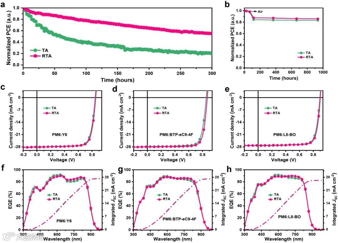 此外,RTA方法在其他4种高效率活性层系统(聚合物:小分子和全聚合物体系)也表现出极好的普适性:PM6:Y6(RTA 18.61% vs. TA 18.17%)、PM6:BTP-eC9-4F(RTA 19.29% vs. TA 18.48%)、PM6:L8-BO(RTA 19.67% vs. TA 19.16%)和 PM6/PJ1-γ(RTA 17.56% vs. TA 17.10%)。如果RTA调控合适,RTA有可能对其他光伏系统也能产生积极的影响,这为未来制备高效 OSC 提供了一种简单、廉价且有效的方法。