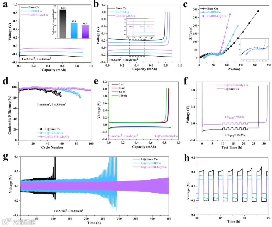 因为有-NO3-和-NH2官能团的存在,甘氨酸修饰的MOF能够加快Li+在界面的传输速率,这也是抑制枝晶的生长,因此有更稳定的电极/电解质界面。通过对比研究发现裸铜电极上的最低形核过电位是甘氨酸修饰MOF包覆电极上的两倍多(84.3 : 36.7 mV),测试Li-Cu电池中极化电压也是数倍的关系(430 mV : 110 mV),Li-Cu和Li-Li电池的循环性能数据也同样表现出甘氨酸修饰MOF包覆电极的性能优异。通过比较不同界面上Li+转移活化能更能直观看出差异,在裸铜电极上Li+转移活化能需要56.4 kJ/mol而甘氨酸修饰MOF包覆电极上活化能只需要36.8 kJ/mol。
