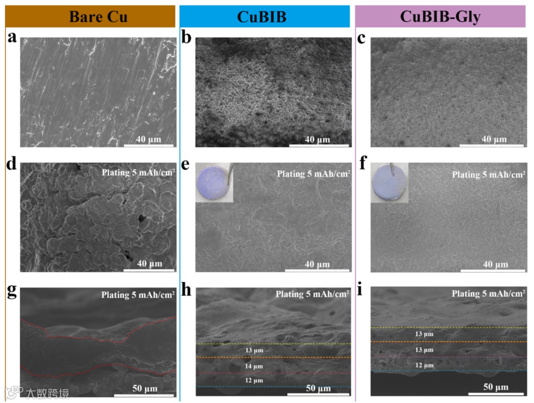 对比研究了裸铜电极和MOF包覆的铜电极上各沉积5 mAh/cm2的金属Li后的形貌发现裸铜电极上沉积的金属Li不够均匀紧密且有许多的空隙,而MOF包覆的铜电极上金属Li能紧密均匀的沉积,且甘氨酸修饰后的MOF包覆电极表面更平整。通过在不同电流密度下(1 mA cm−2 , 2 mA cm−2和5mA cm−2)测试的对称电池极化电压曲线也能看出由甘氨酸修饰的MOF包覆电极有更低的极化电压,更好的稳定性。
