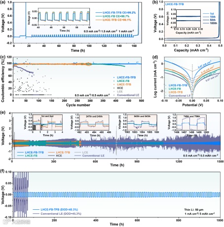 要点二:薄且稳定的富含LiF的SEI提升了锂金属负极的界面稳定性,使得锂金属电池能够以高库伦效率进行长循环。