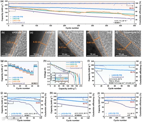 要点三:LHCE-FB-TFB显著提升Li||NCM811电池循环稳定性,常规条件下循环400圈之后容量保持率为80%,在高截止电压和高温下仍然具有良好的循环性能。
