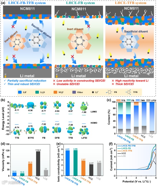 要点一:提出部分牺牲型混合稀释剂策略来调控局部高浓度电解液。由相对惰性的氟苯(FB)作为主要稀释剂,由高LiF生成活性的1,3,5-三氟苯(TFB)作为少量的牺牲型稀释剂,调控稀释剂在电解液/电极界面处形成SEI/CEI的化学活性,能够与阴离子协同生成薄且稳定的富含LiF的SEI/CEI。