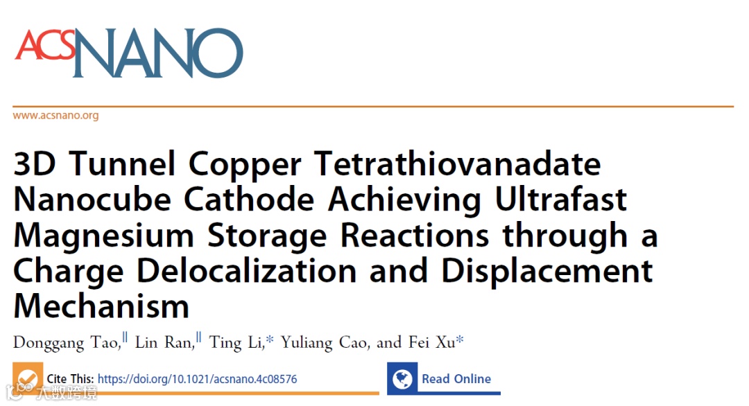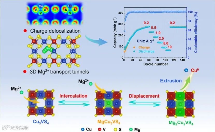 近日,武汉大学徐飞/中南民族大学李婷课题组在ACS Nano期刊上发表题为“3D Tunnel Copper Tetrathiovanadate Nanocube Cathode Achieving Ultrafast Magnesium Storage Reactions through a Charge Delocalization and Displacement Mechanism”的研究文章。本工作在综合考虑材料晶体结构和电子结构的情况下,设计开发了一种四硫代钒酸铜 (Cu3VS4) 正极。V和S原子形成高共价键比例的化学键,促进电子通过V‒S键离域,减少了与二价Mg2+的相互作用,诱导了V和S的共氧化还原。Cu3VS4的晶体结构具有交错的3D隧道,有利于固态Mg2+传输。Cu3VS4具有高容量、高倍率、优异的循环稳定性,且在高活性物质负载情况下仍能实现高倍率性能。本研究所揭示的储镁性质与电子结构的相互关系,为设计高性能镁电池正极材料提供了合理的思路。