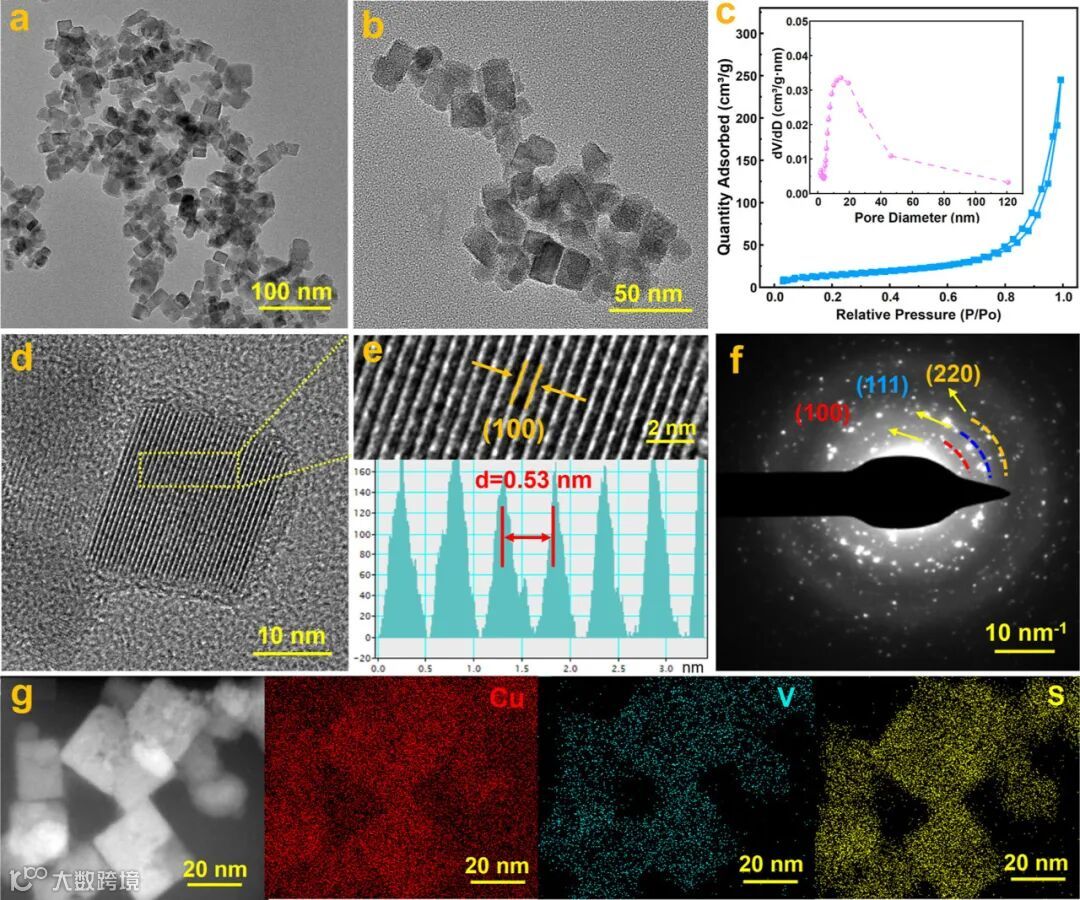 图2. Cu3VS4的 (a, b) TEM,(c) BET,(d, e) HRTEM,(f) SAED和 (g) EDS。
