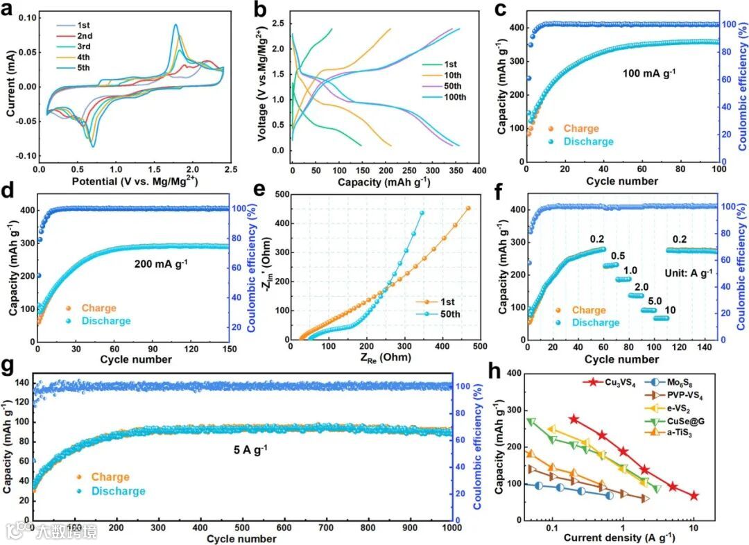 图3. Cu3VS4的 (a) CV曲线,(b) 100 mA g‒1下的充放电曲线,(c) 100 mA g‒1下的循环性能,(d) 200 mA g‒1下的循环性能, (e) EIS ,(f) 倍率性能,(g) 长循环性能和 (h) 倍率能力的比较。