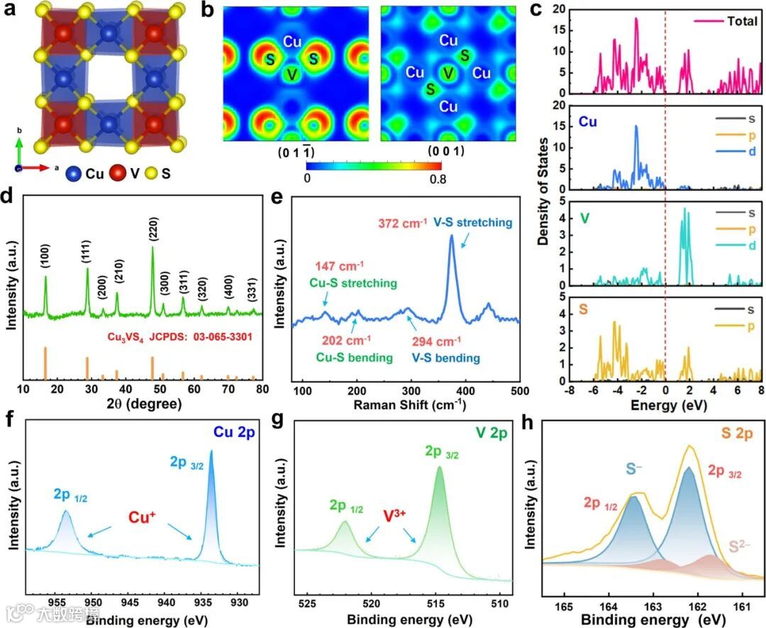 图1. Cu3VS4的 (a) 晶体结构,(b) 沿(0)面和(001)面的电子局域化函数(ELF),(c) 态密度(DOS),(d) XRD,(e) Raman和 (f) Cu 2p,(g) V 2p 和 (h) S 2p的XPS谱。