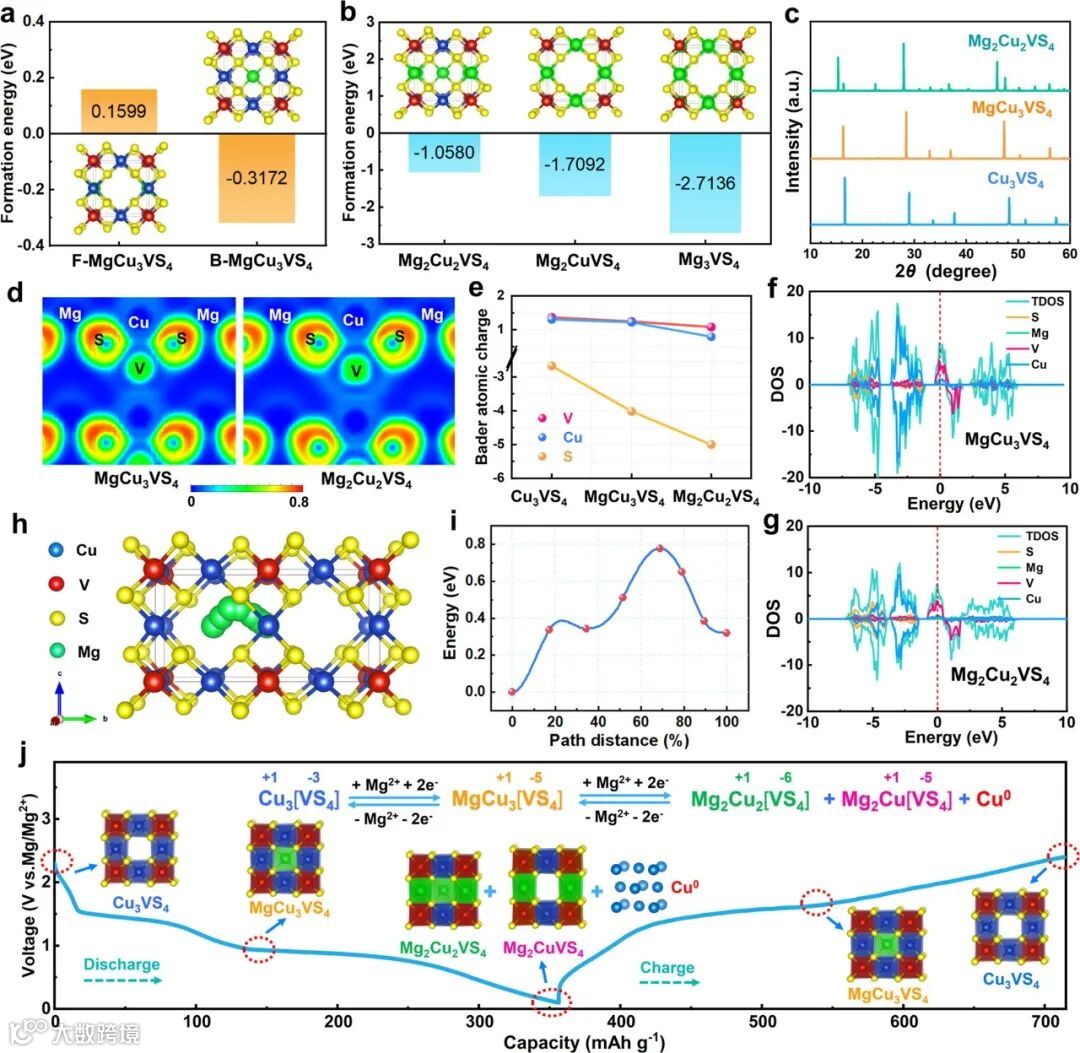 图7. (a) 嵌入反应产物和 (b) 置换反应产物的形成能,(c) 充放电产物的模拟XRD谱,放电产物的(d)电子局域函数(ELF)、(e) Bader原子电荷、(f, g) 态密度(DOS)。嵌入反应的(h)Mg2+扩散路径和(i)能垒。(j) Cu3VS4的储镁机理示意图。