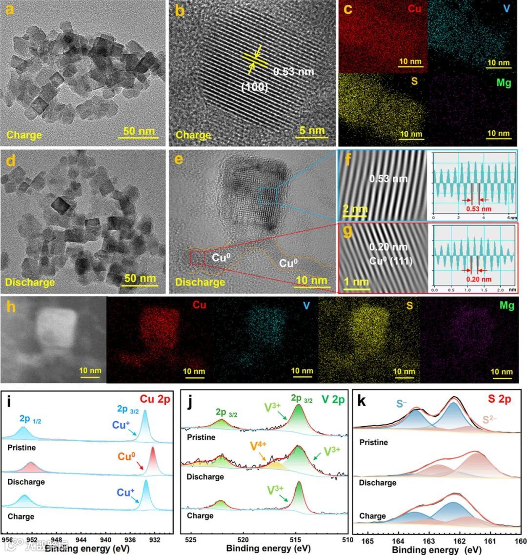 图6. Cu3VS4在第20周充电状态下的 (a) TEM,(b) HRTEM 和 (c) EDS。Cu3VS4在第20周放电状态下的 (d) TEM、(e) HRTEM、(f, g) 晶格条纹和 (h) EDS。Cu3VS4充放电态的 (i) Cu 2p, (j) V 2p 和 (k) S 2p 的XPS。