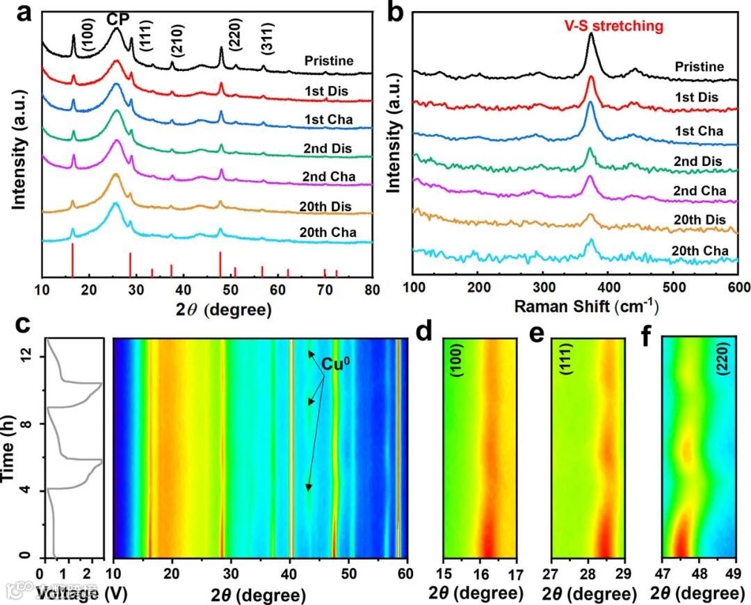 图5. Cu3VS4的 (a) 非原位 XRD,(b) 非原位Raman,(c) 原位XRD和 (d-f) 局部放大图像。