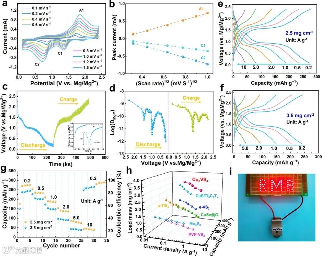 图4. Cu3VS4的 (a) 不同扫描速率下的CV曲线,(b)相应的峰值电流-(扫描速率)1/2 图,(c) GITT 曲线和 (d) Mg2+ 扩散系数,(e-g) Cu3VS4在不同活性材料负载下的倍率能力,(h) 与报道的镁电池正极的比较,(i) Mg||Cu3VS4电池。