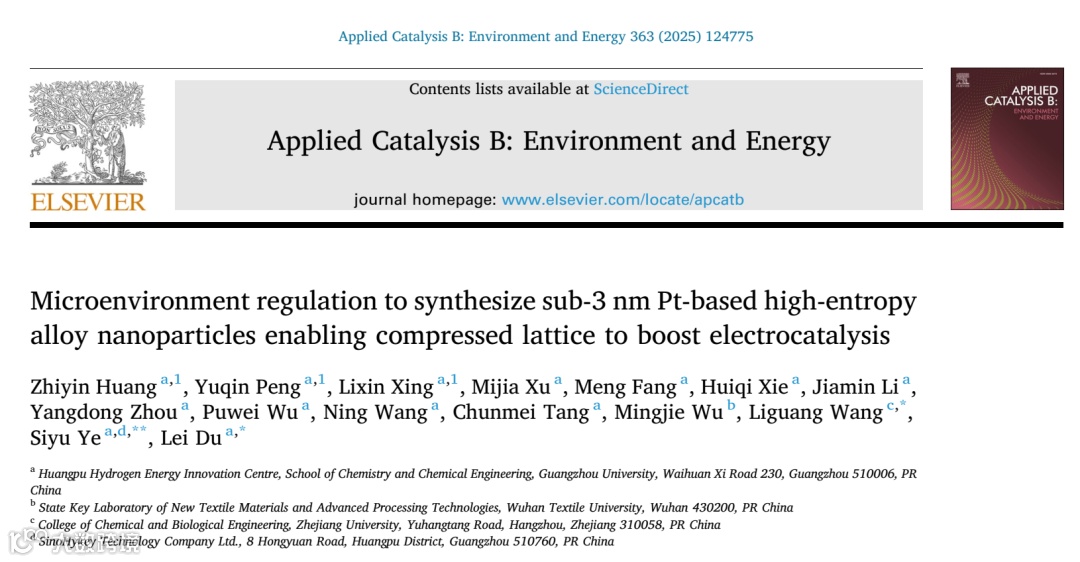 近日,来自广州大学叶思宇院士团队的杜磊副教授与浙江大学的王利光研究员合作,在国际知名期刊Applied Catalysis B: Environmental and Energy上发表题为“Microenvironment regulation to synthesize sub-3 nm Pt-based high-entropy alloy nanoparticles enabling compressed lattice to boost electrocatalysis”的研究文章。该工作提出了一种灵活的微环境调节策略,以调整碳热冲击热解前驱体中的溶剂极性和纳米颗粒-载体相互作用。发现溶剂极性的降低和颗粒-载体亲和性的增强可以共同控制纳米颗粒的大小,最终达到~2.68 nm, Pt负载为~10 wt%。HEA粒子中压缩的晶格条纹导致电子在Pt原子上聚集,并建立适度的电荷密度重排,在酸性介质中表现出比Pt/C更强的多功能HER/HOR/ORR活性。