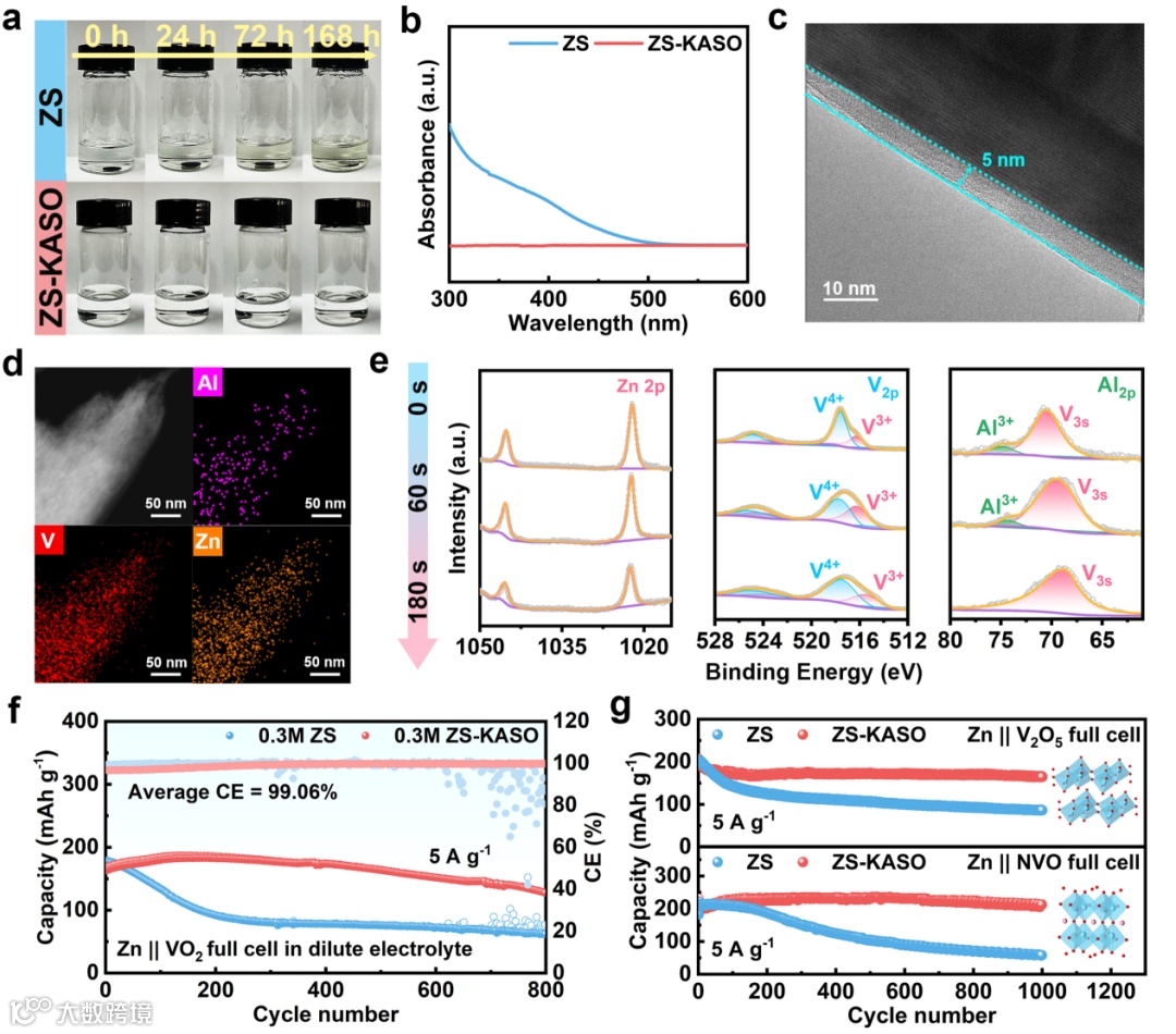 图5. (a) 浸入VO2正极后的ZS和ZS-KASO电解质的颜色观察。(b) 浸入后溶液的紫外可见光谱。(c) 在ZS-KASO电解质中循环20次后VO2电极的TEM图像。(d) 在ZS-KASO电解质中,在0.2 A g-1的第一圈满充电状态下VO2电极的元素分布图。(e) 在ZS-KASO电解质中循环20次后完全充电的VO2正极的深度XPS测试。(f) 电流密度为5 A g-1时,Zn || VO2全电池在稀电解质(0.3M)中的循环性能。(g) 电流密度为5 A g-1时,Zn || V2O5和Zn || NVO全电池在ZS和ZS-KASO电解质中的循环性能。