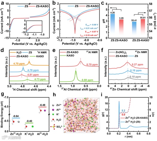 图3. (a) ZS和ZS-KASO电解质中的LSV曲线。(b) Zn在ZS和ZS-KASO电解质中Tafel曲线。(c) 不同电解质的离子电导率和pH值。(d) H2O、ZS、ZS-KASO和纯KASO 溶液的1H NMR谱。(e) ZS-KASO和纯KASO溶液的27Al NMR谱。(f) 以Zn(NO3)2为标准样品,ZS和ZS-KASO电解质为测试样品的67Zn NMR光谱。(g) 通过DFT计算获得的H2O与不同物种的相对结合能。(h) ZS-KASO电解质在MD模拟的快照。(i) ZS-KASO 和ZS电解质通过MD模拟获得的RDF和CN图。