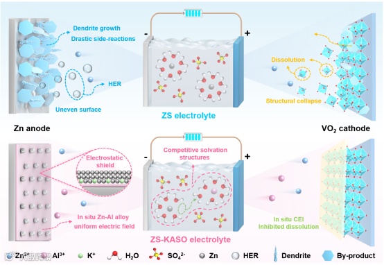 图1. Zn || VOx电池在ZS和ZS-KASO电解质中的示意图