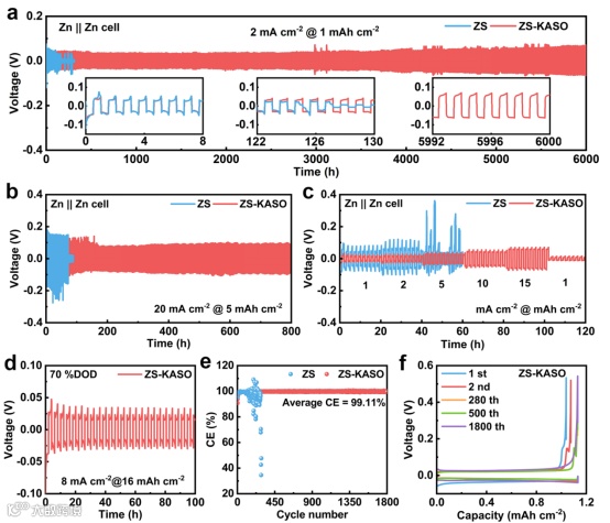 图2. (a) 使用不同电解质的Zn || Zn对称电池在2 mA cm-2@1 mAh cm-2条件下的长循环性能(以 2@1 表示)。(b) 使用不同电解质的Zn || Zn对称电池在20@5条件下的循环性能。(c) 使用不同电解质的Zn || Zn对称电池的倍率性能。(d) Zn || Zn对称电池在ZS-KASO电解质中以 70%的DOD循环。(e) 使用不同电解质组装的Zn || Cu半电池的CE结果。(f) Zn || Cu半电池在ZS-KZSO电解质中的沉积/剥离曲线。