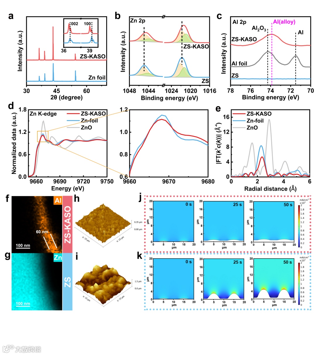 图4. (a) 在1@1条件下不同电解质中循环20次后锌负极的XRD图谱。(b) 在1@1条件下的不同电解质中循环20次后锌负极Zn 2p 的XPS光谱。(c) 在1@1条件下的不同电解质中循环20次后铝箔和锌负极的Al 2p XPS光谱。(d) 在1@1条件下的ZS-KASO电解质中循环20次后锌负极的XANES光谱和(e) EXAFS光谱。在1@1条件下于ZS-KASO中循环的锌负极的(f)Al和(g)Zn的截面EDS图谱。在(h)ZS-KASO和(i)ZS电解质中循环后锌表面的原子力显微镜图像。在(j)裸锌电极和(k)原位锌铝合金保护电极上锌沉积过程中的模拟电场分布。