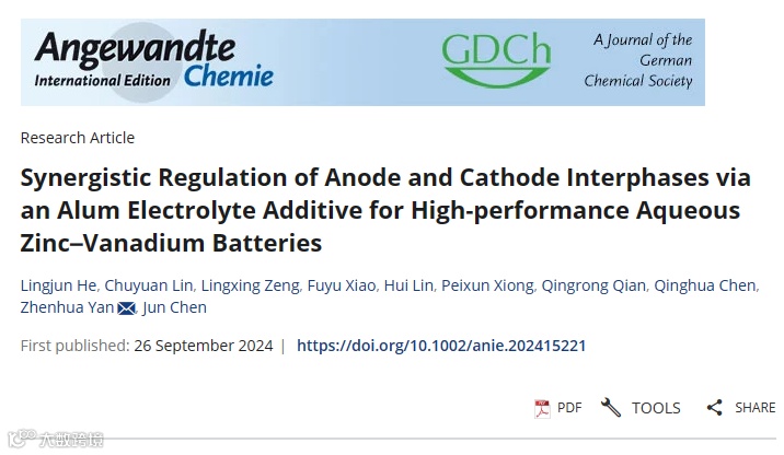 Synergistic Regulation of Anode and Cathode Interphases via an Alum Electrolyte Additive for High-performance Aqueous Zinc-Vanadium Batteries Lingjun He, Chuyuan Lin, Lingxing Zeng*, Fuyu Xiao, Hui Lin, Peixun Xiong, Qingrong Qian, Qinghua Chen, Zhenhua Yan*, Jun Chen* Angewandte Chemie International Edition
