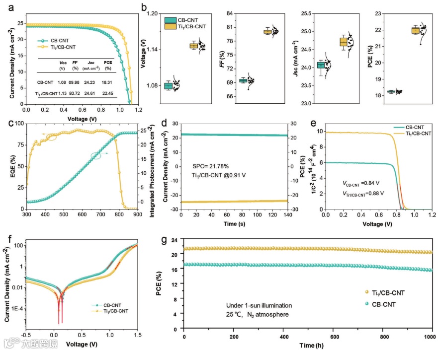 随后,研究者系统地比较了在FTO/SnO2/钙钛矿/spiro-OMeTAD/CB(或Ti1/CB)/CNT/FTO结构的DC-PSCs中,CB和Ti1/CB作为碳电极的性能。图4a给出了两种DC-PSCs器件的J-V曲线。在模拟AM1.5 G太阳光照(100 mW cm−2)下,CB-CNT DC-PSCs器件的PCE为18.31%,开路电压(VOC)为1.08 V,短路电流(JSC)为24.23 mA cm−2,填充因子(FF)为69.98%。相比之下,基于Ti1/CB-CNT的器件的PCE大幅提高,达到22.45%,VOC为1.13 V,JSC为24.61 mA cm−2,FF为80.72%。最后,研究者监测了这两种类型的DC-PSCs的长期光稳定性。如图4g所示,未封装的Ti1/CB-CNT DC-PSCs的PCE即使在一个太阳强度下连续工作1000小时后仍保持在初始值的95%以上。这可能得益于碳电极的固有稳定性以及在spiro-OMeTAD和Ti1/CB界面上高效的电荷提取和传输。