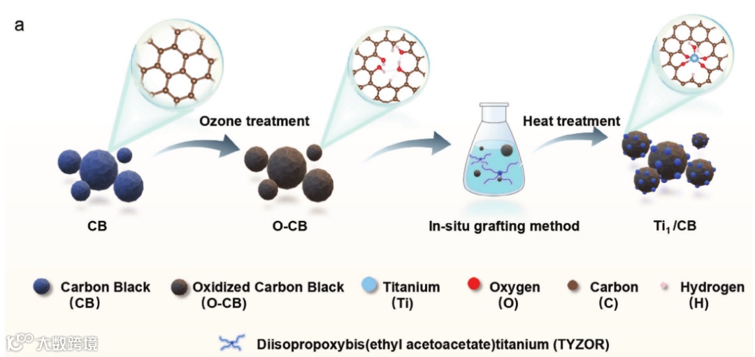在DC-PSC中,碳电极和相邻功能层spiro-OMeTAD之间的能级失配会导致界面处形成能垒,阻碍空穴传输,进而加重载流子非辐射复合损失,最终影响器件整体性能。研究人员在炭黑(CB)表面成功担载了单原子级分散的钛(Ti)原子,制备出了炭黑担载钛单原子的新型碳电极材料Ti1/CB。图2.(a)展示了Ti1/CB的制备过程,包括三个步骤。最初,使用臭氧处理CB以增强其表面含氧官能团的存在。接着,将臭氧处理的CB分散在双(乙酰丙酮基)二异丙基钛酸酯的异丙醇溶液中。最后,在惰性气氛保护下加热,即可制备炭黑担载钛单原子的碳电极材料Ti1/CB。