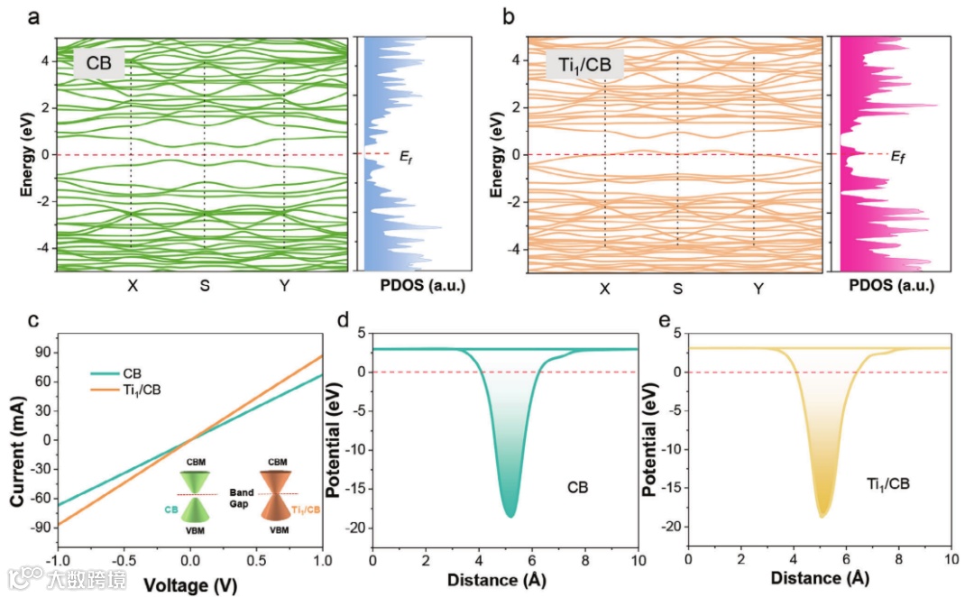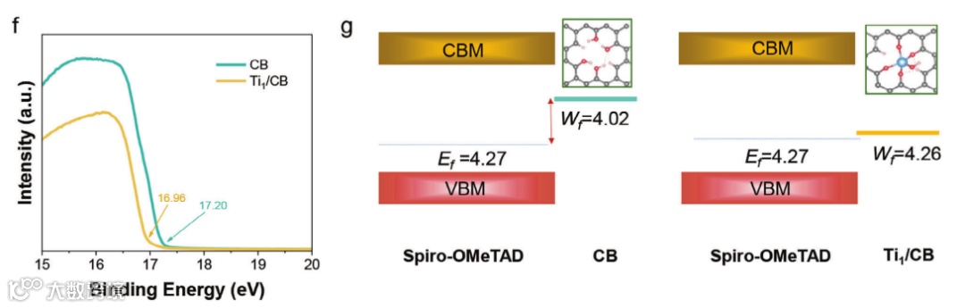 基于同步辐射的X射线吸收近边结构(XANES)谱和扩展X射线吸收精细结构谱(EXAFS)可进一步识别Ti1/CB中Ti原子的配位结构(图2.b-e)。利用解析配位结构,研究者们可以建立CB和Ti1/CB的化学结构模型,在此基础上,研究者们进行了DTF理论计算,研究了Ti原子对CB能带结构的影响。如图3a、3b所示,基于CB结构模型的能带结构在0.56 eV时存在带隙,说明CB具有半导体特性,不利于导电。在负载Ti原子后,费米能级移动到价带中,使Ti1/CB具有金属特性和更高的电导率。为了进一步验证加载Ti原子对CB电导率的影响,研究者们对具有FTO/cabor/FTO结构的器件进行了LSV测试。如图3c所示,Ti1/CB的电导率优于CB,这与理论计算结果一致。DFT计算结果表明,引入SAMs-Ti可以改变CB的能级结构,使其功函数从4.28 eV提高到4.69eV(图3d和3e)。