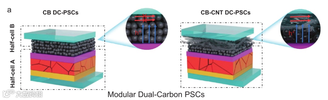 为了优化电荷转移动力学,研究者们设计了一种模块化双碳电极,利用炭黑(CB)和碳纳米管(CNT),以提高有效的载流子传输和收集在电极和相关接口,同时抑制非辐射复合损失。图1.a所示为模块化双碳基钙钛矿太阳能电池(DC-PSC)的示意性架构。它包括两个半电池,半电池A用作光阳极,半电池B用作对电极。光阳极由FTO、SnO2、钙钛矿、spiro-OMeTAD和碳电极(C1)组成,而对电极由FTO和另一碳电极(C2)组成。然后将两个独立的半电池堆叠在一起以形成完整的DC-PSC器件。这种创新的设计便于灵活地组装、拆卸、维护和更新,为未来薄膜太阳能电池的大规模模块化制造提供了方案。研究者们选择零维CB作为C1的电极材料,小的炭黑颗粒能够与相邻的功能层spiro-OMeTAD形成足够的界面接触,这有助于在C1电极与spiro-OMeTAD的界面处纵向提取光生电荷。研究者们选择一维CNT作为C2的电极材料(control为CB),其高纵横比结构可以插入零维CB中并实现有效的界面耦合。此外,一维CNT的存在丰富了电荷传输的途径,促进了电荷的水平横向收集。以CNT为C2电极的CB-CNT DC-PSCs相较于control(CB DC-PSCs),其光学与电学性能获得了显著的提升。