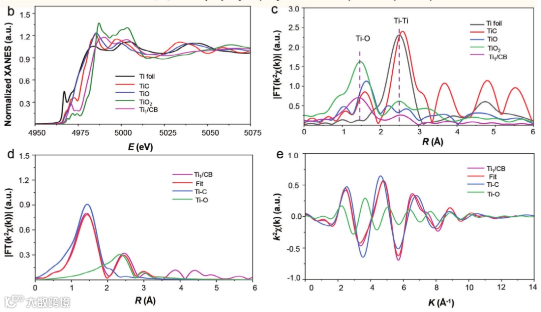 图2. a) Ti1/CB的合成路线示意图。b)不同样品的归一化Ti K边X射线吸收近边结构(XANES)光谱。c) Ti1/CB与参考材料(Ti箔、TiC和TiO2)在R空间的k^2加权傅里叶变换(FT)光谱。d) Ti1/CB扩展X射线吸收精细结构(EXAFS)光谱的曲线拟合分析。e) Ti1/CB在q空间对应的拟合结果。