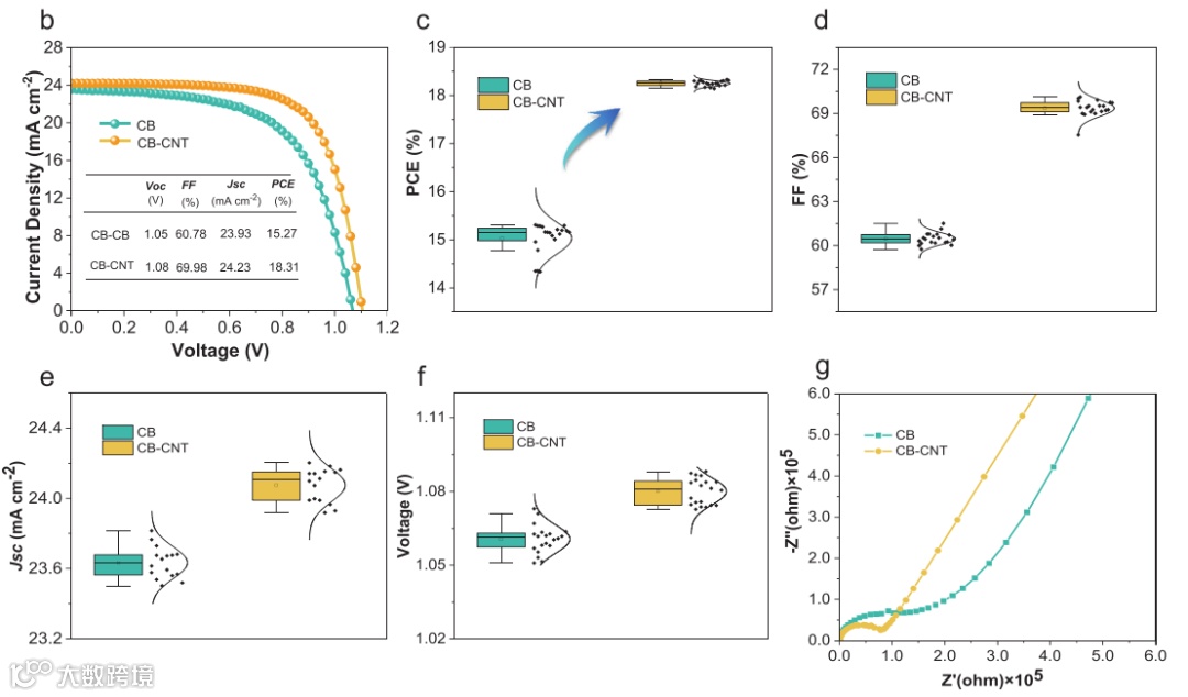 图1. a) 模块化双碳钙钛矿太阳能电池(DC-PSCs)的示意图。左边的图像展示的是CB DC-PSCs,而右边的图像展示的是CB-CNT DC-PSCs。b) CB DC-PSCs和CB-CNT DC-PSCs的电流密度-电压(J–V)曲线。c–f) 光电转换效率(PCE)、填充因子(FF)、短路电流密度(JSC)和开路电压(VOC)的统计分布。g) CB DC-PSCs和CB-CNT DC-PSCs的Nyquist图。