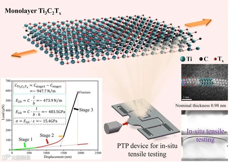 图1. 利用PTP装置实现对单层Ti3C2Tx 纳米片的原位拉伸测试